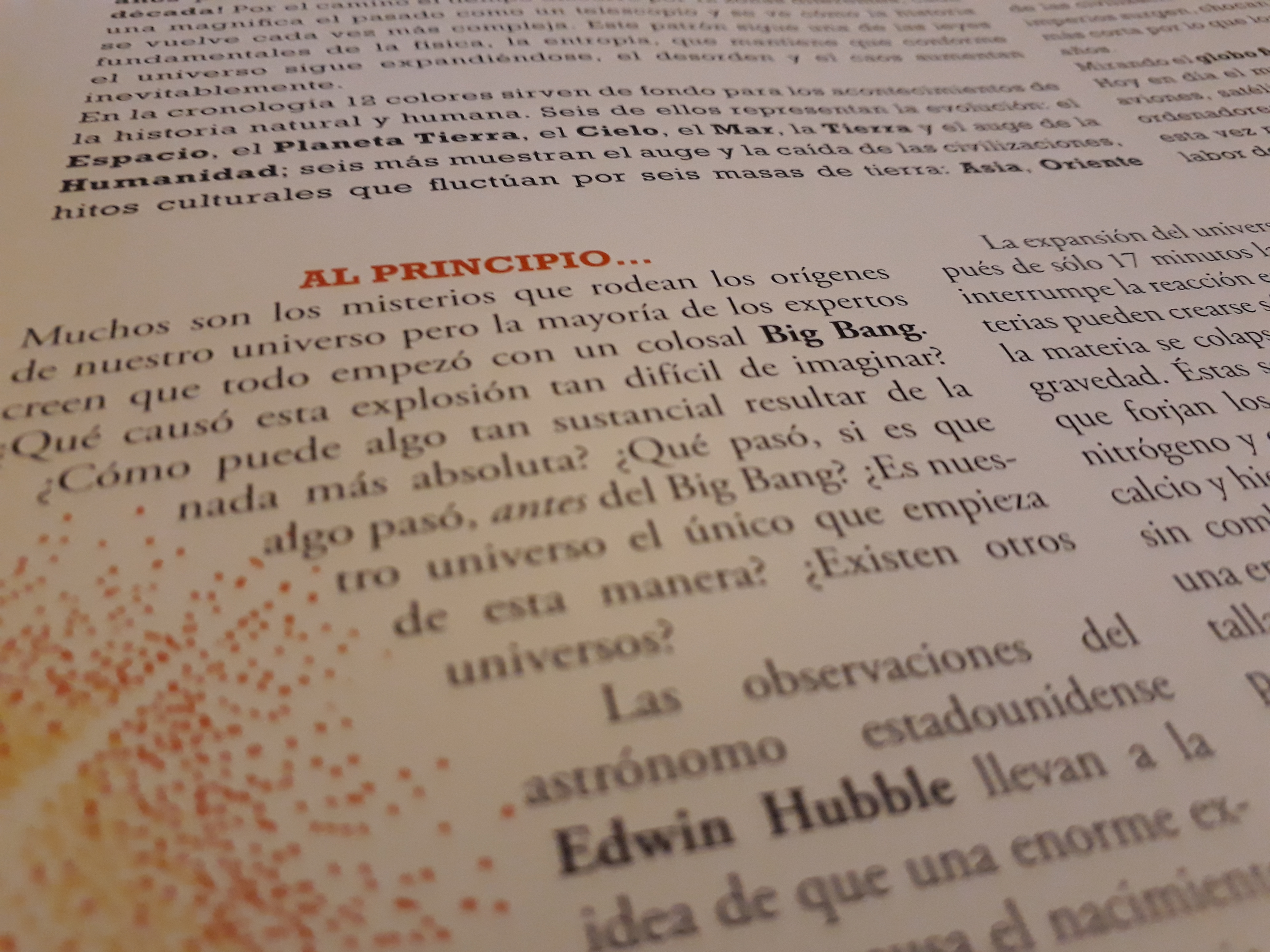 La lectura te lleva a sentir, desde el Big Bang , pasando por la formación geológica de la placas tectónicas, la germinación de la vida por moléculas biológicas, hasta los dinosaurios, Napoleón, Colón y Obama.