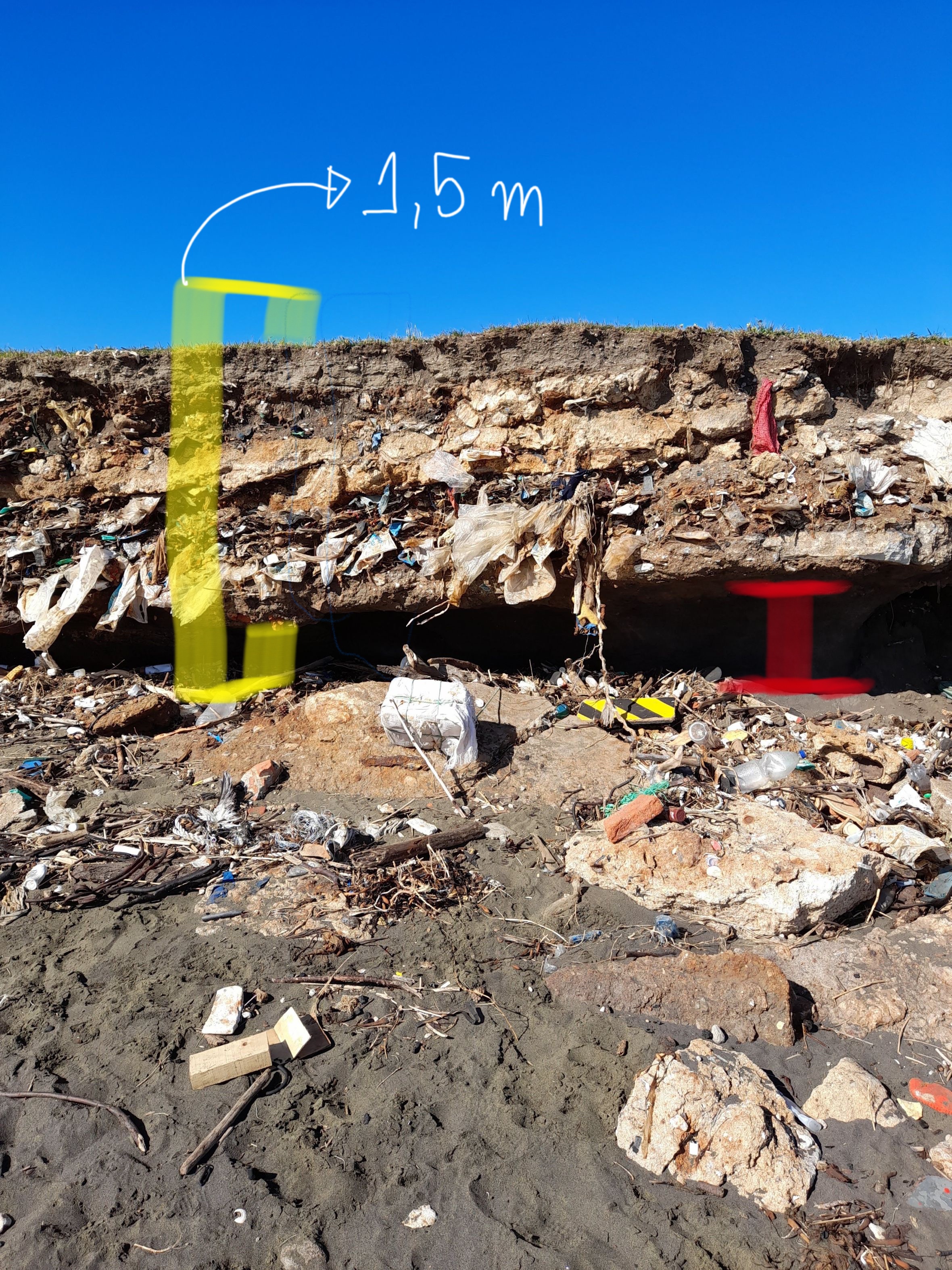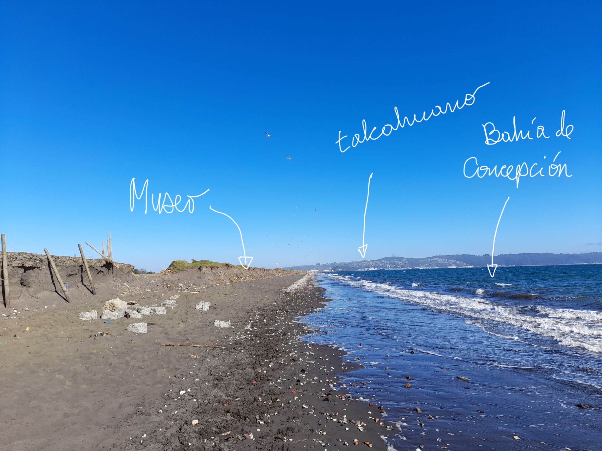 Corrían los años 80s, en este lugar que se sitúa entre el borde costero y el ecosistema de humedal del río Andalién, se operó un vertedero de la comuna de Talcahuano. Este se cerró por los propietarios y sus operadores. Pasaron algunas décadas y un fuerte terremoto del 27 de febrero de 2010, para que esta zona cambiara en su exposición a las olas. Se incrementó la erosión de la ladera expuesta al mar, son 3 km aproximadamente de frente expuesto de desechos hospitalarios y domiciliarios que día a día se asoman a causa de la erosión. En este sitio es posible ver basura de décadas pasadas.